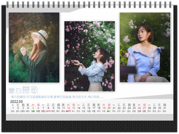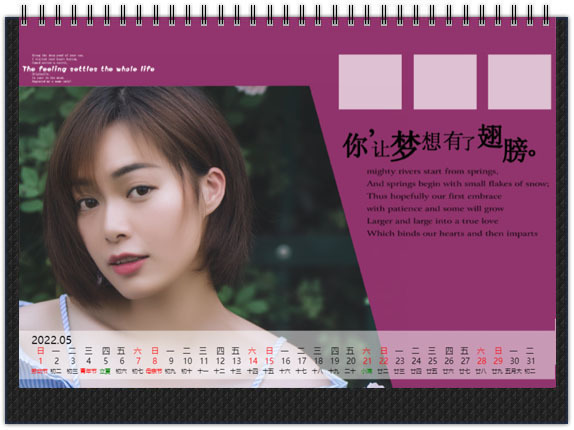 经典的横式个性台历十分耐看,三角架造型十分牢固,作为装饰放在客厅或者办公桌上,都是一道特别的风景线。用您喜欢的照片给自己最亲的朋友、最爱的家人、心仪的他(她)做一本经典个性台历,让爱365天天天相随。