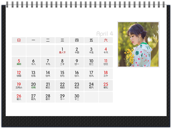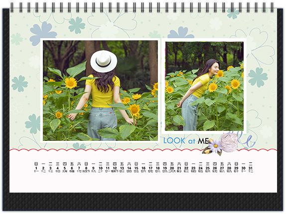 传统的6×8英寸横式个性台历,可折叠的底座,经典款式,大气又实用。正反双面印刷,两面都可以放置照片,比市面上的台历多一倍的放图空间,价格更有优势。正面是大图搭配小日期,背面是小图搭配大日期,非常的明了,可以在背面对特殊日子进行特别编辑。