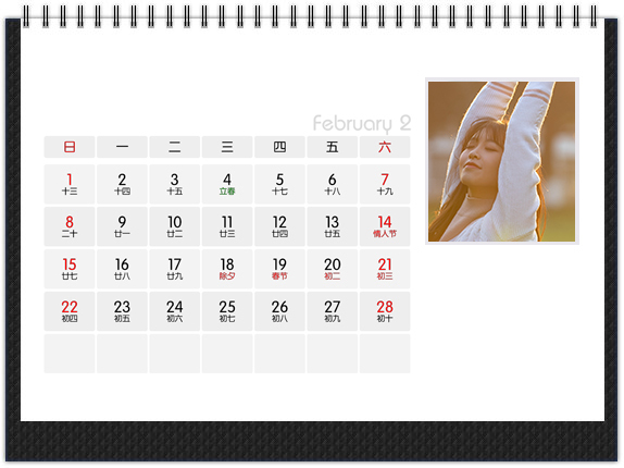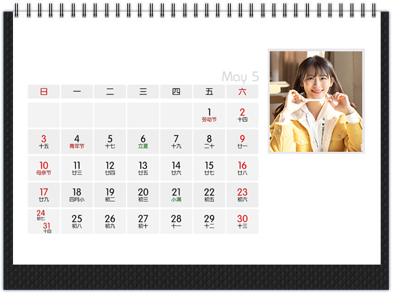 传统的6×8英寸横式个性台历,可折叠的底座,经典款式,大气又实用。正反双面印刷,两面都可以放置照片,比市面上的台历多一倍的放图空间,价格更有优势。正面是大图搭配小日期,背面是小图搭配大日期,非常的明了,可以在背面对特殊日子进行特别编辑。