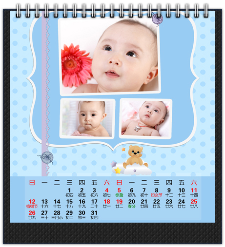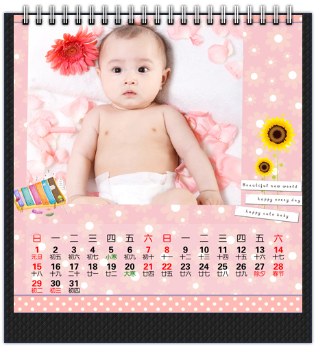 时尚个性台历小巧有型,精致的造型,最适合放置于办公桌上。把自己的宝宝或者恋人放在办公桌上,疲劳的时候、工作不顺的时候看看他们大大的笑脸,你会觉得浑身有冲劲,他们就是你前进的动力。
